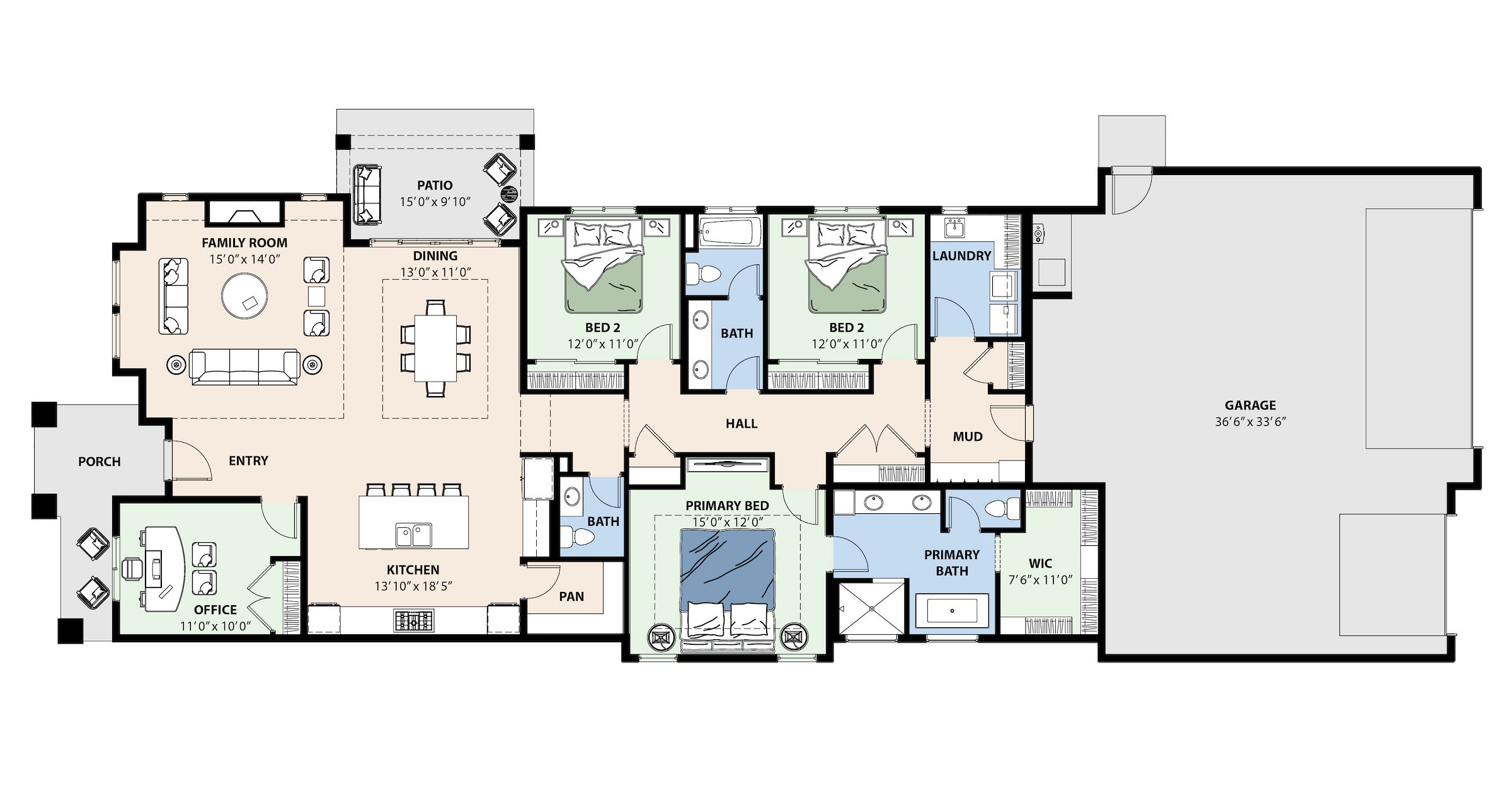 The Hayden is a single-level home with three bedrooms and two and a half bathrooms, designed for easy living and effortless entertaining. With an open-concept layout connecting the kitchen, dining, and living spaces, plus a dedicated office and low-maintenance yard, this home combines comfort and convenience. Enjoy a spacious three-car garage and covered patio for year-round living.